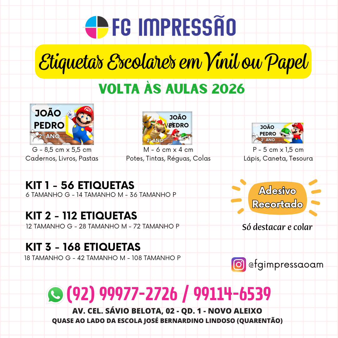 Identifique todo o material escolar com praticidade e estilo. As etiquetas da FG Impressão são ideais para cadernos, lápis, potes de tinta, réguas, livros e muito mais.